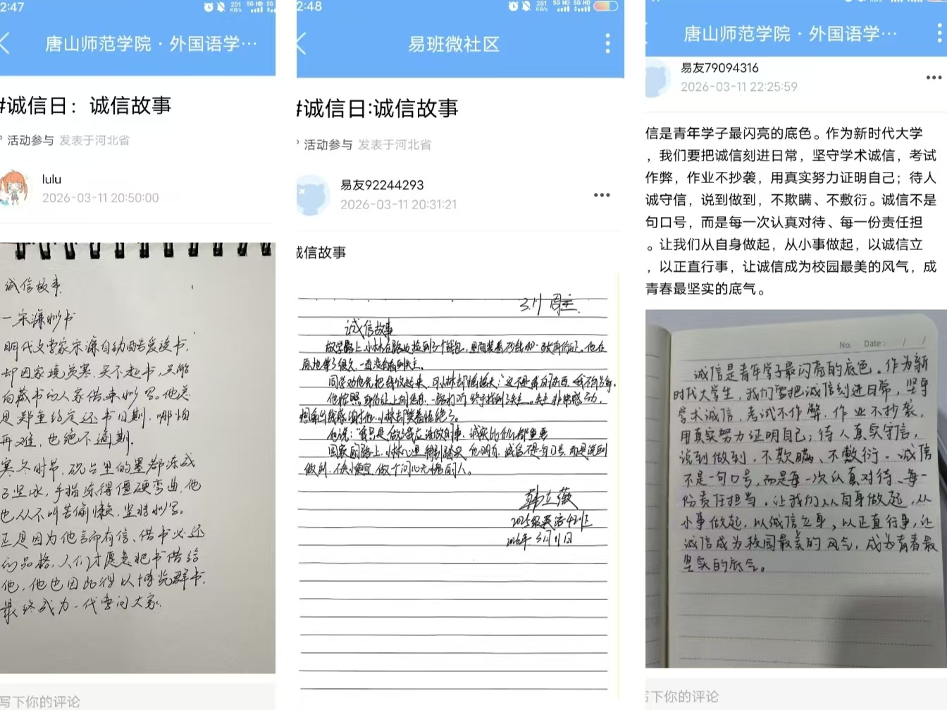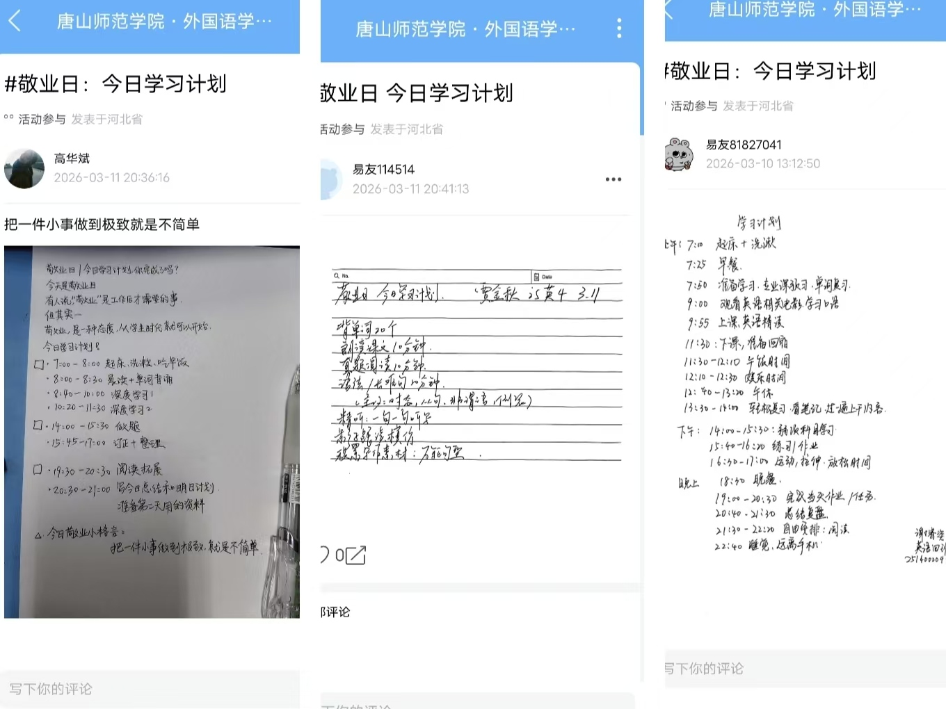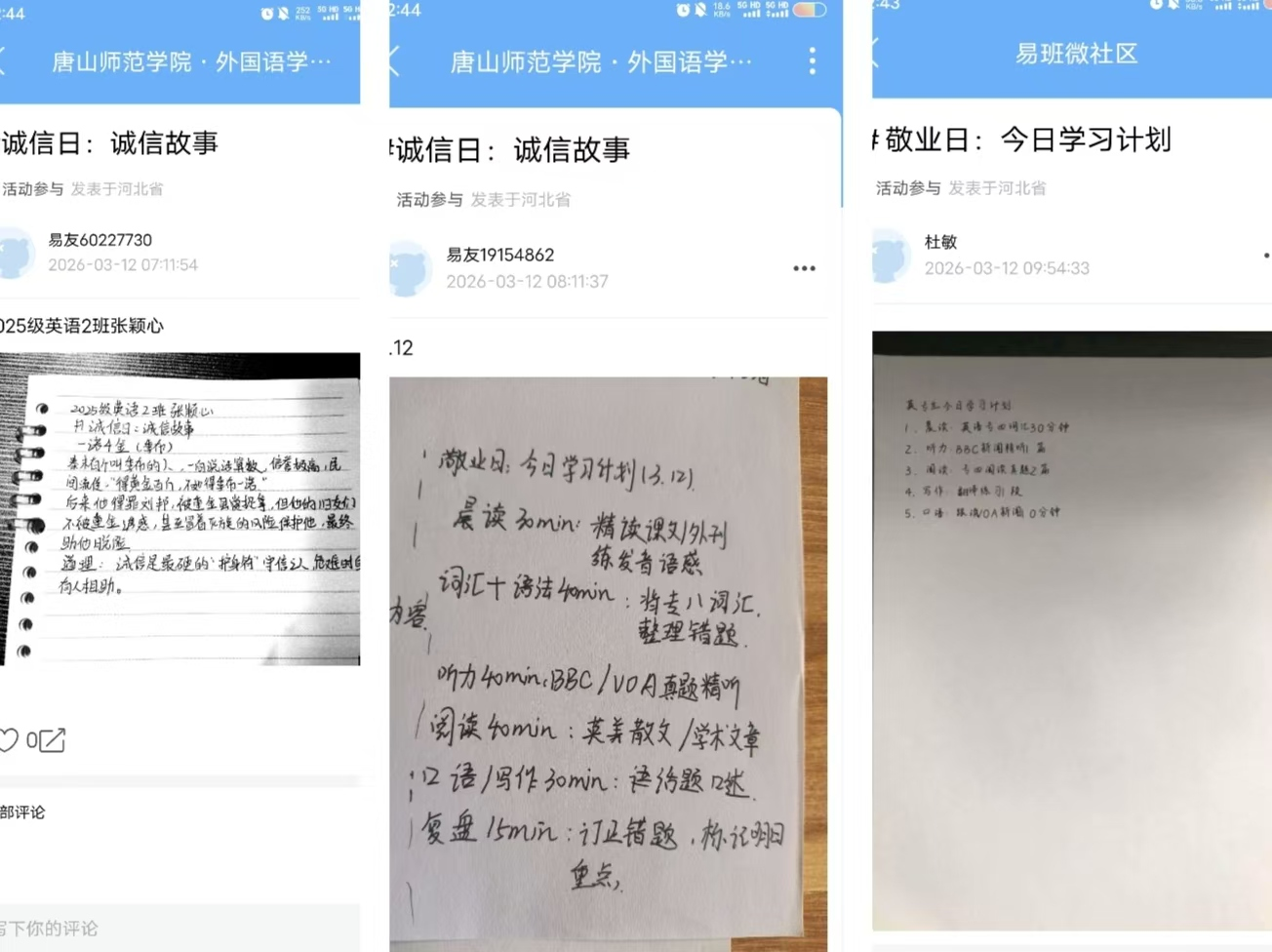 本次活动以“敬业”与“诚信”为核心主题,开展“价值观运动会”线上打卡赛,号召员工在活动期间选定两日,分别完成易班App专属打卡任务。其中“敬业日”需晒出精心规划的当日学习计划,“诚信日”则分享身边的诚信小故事,活动明确要求参与者将打卡内容整理为纸质版后扫描上传图片,发帖标题统一规范为#敬业日:今日学习计划#或#诚信日:诚信故事#,推动核心价值观从书本理论转化为同学们日常践行的生活习惯,真正实现学思用贯通、知信行统一。
