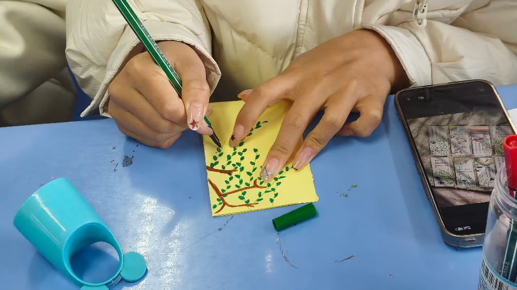 活动旨在打破传统心理活动的固有形式,探索寓教于乐的新路径。与侧重竞技对抗的活动不同,本次设计以静心创作、情感表达为核心,弱化竞争氛围,着重强调专注与自我疗愈。在主持人的引导下,同学们领取彩色卡纸、马克笔、胶棒等创作材料,围绕“春日”主题开启书签设计。先将卡纸裁剪成心仪的形状,再用马克笔勾勒花草、飞鸟等春日意象,或书写饱含春意的短句、英文诗句,最后用胶棒粘贴装饰细节,让朴素的卡纸逐渐蜕变为独具个性的春日书签。