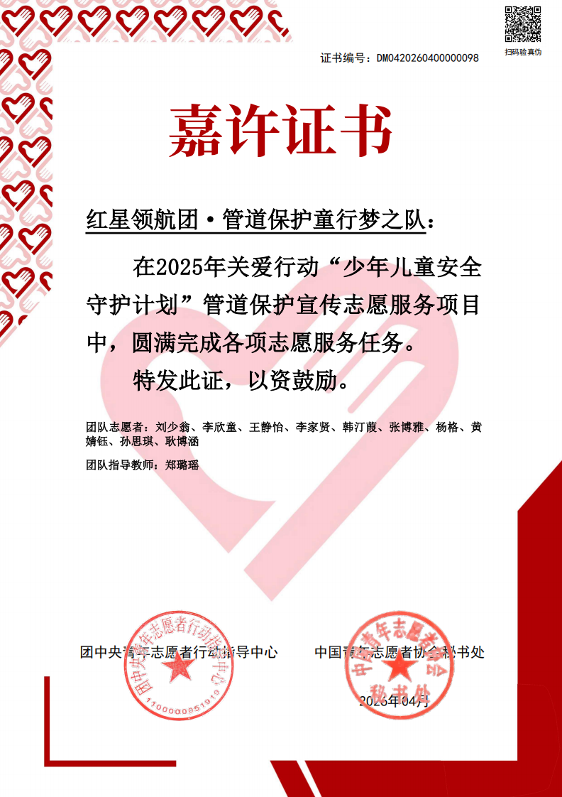 近日,团中央青年志愿者行动指导中心、中国青年志愿者协会秘书处公布2025年关爱行动“少年儿童安全守护计划”全国老员工管道保护宣传志愿服务活动评选结果。suncitygroup太阳新城“红星领航团·管道保护童行梦之队”从全国千余支高校团队中脱颖而出,荣获全国嘉许表彰。