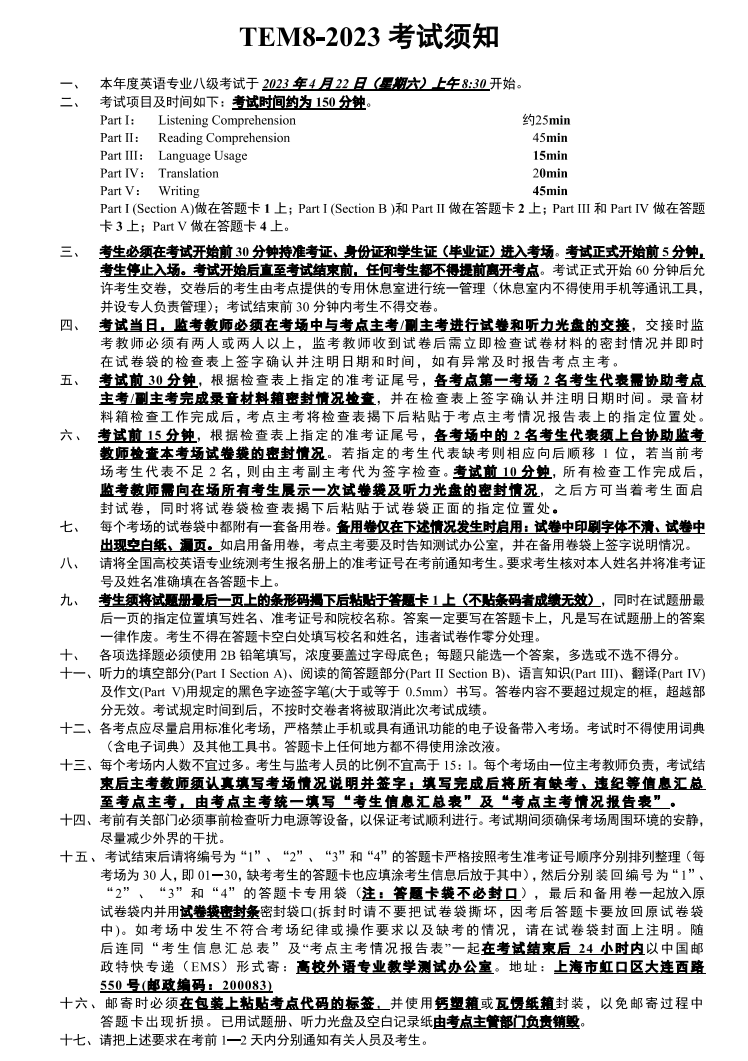 2023年4月22日全国英语专业八级考试(TEM8)考生注意事项