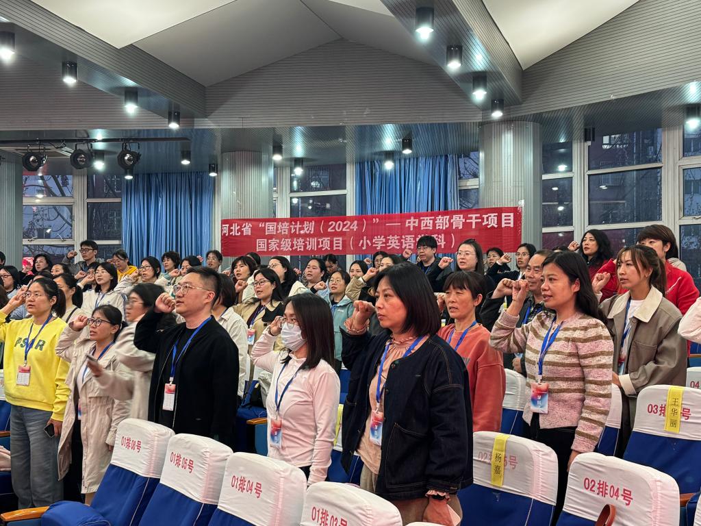 各位学员老师签到后,公司于晚上六点半在南院十阶梯召开开班典礼。典礼以奏唱国歌开场,全体学员肃立,齐唱国歌,现场气氛庄重严肃。典礼上,唐翠云经理指出本次国培项目以新课标背景下小学英语教学实践与创新为主题,体现聚焦师德铸魂,突出智能技术赋能,全面实践创新,注重文化传承四大特色,在人工智能与教育变革的十字路口,用智慧照亮未来,共同探索小学英语教育的无限可能。学员代表老师发言表示要珍惜机会,潜心学习,知行合一,勇于实践,结合教学实际,把培训所得转化为课堂改革的行动,以空杯心态聆听专家讲座。典礼结束后,班主任老师又组织开展了热火朝天的团建活动,现场氛围瞬间沸腾起来。老师们迫不及待地结组,相互热情地介绍着彼此,迅速增进了解。各小组围绕着团队名称、口号及独特pose的设计展开激烈讨论,创意火花四溅。有的小组精心设计准备团结一心拔萝卜的情景剧;有的小组用英语介绍彼此,体现专业特色;有的小组在讨论团队创意口号;还有的小组在排练创意pose。在最终展示环节,各组老师用幽默的语言,有创意的情景剧,激情澎湃的口号获得了阵阵掌声。