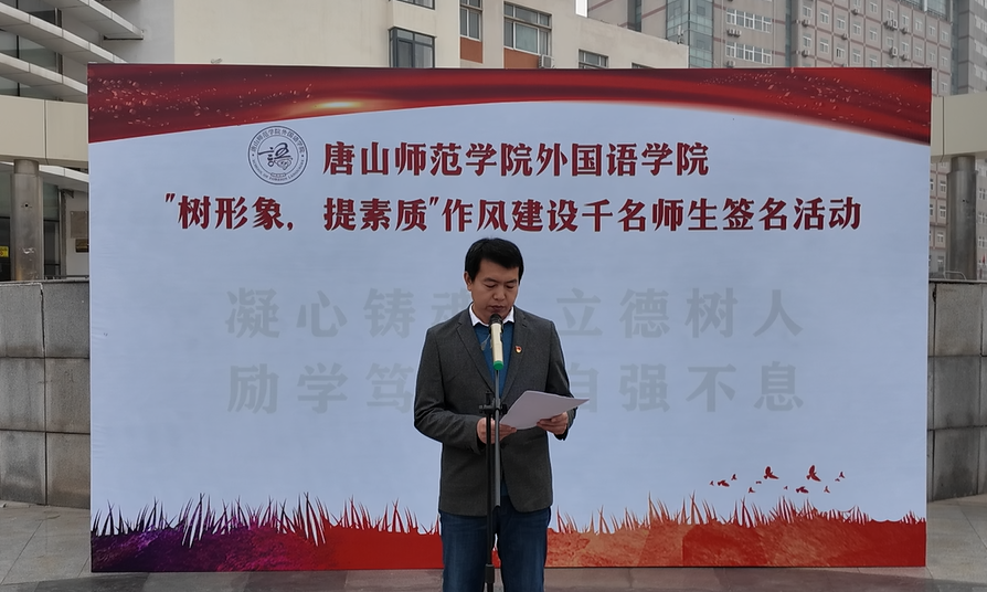 会上,谷书记宣讲了公司文件,介绍本次活动的主旨,教师要“凝心铸魂、立德树人”,员工要“励学笃行、自强不息”。李景峰老师代表全体教师作表态发言,他从外院建设、教师发展、价值追求三个方面出发,强调作风建设的重要性,号召师生共同参与,营造风清气正的外院公司产品环境,王紫诺同学代表全体员工作表态发言:作为新时代的青年老员工,要保持健康向上的作风,积极担当作为,勇做新时代的弄潮儿。