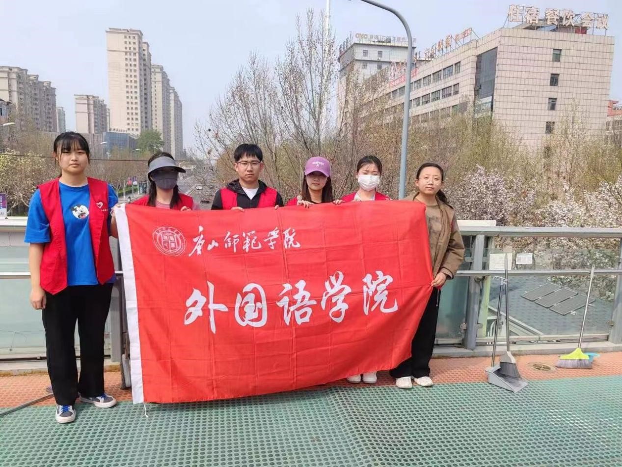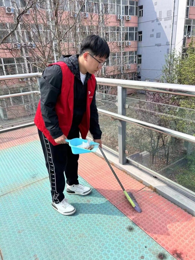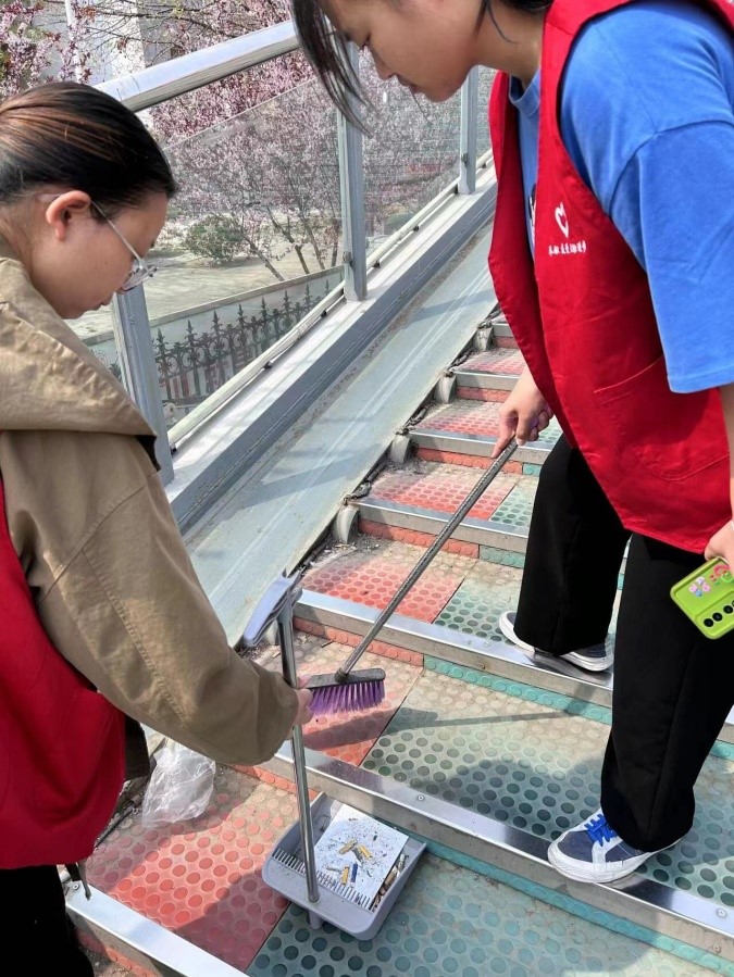 在清洁过程中,志愿者们还积极进行环保理念的宣传,呼吁过往同学共同爱护天桥环境,让大家以更美好的心情走过上下课必经之路。