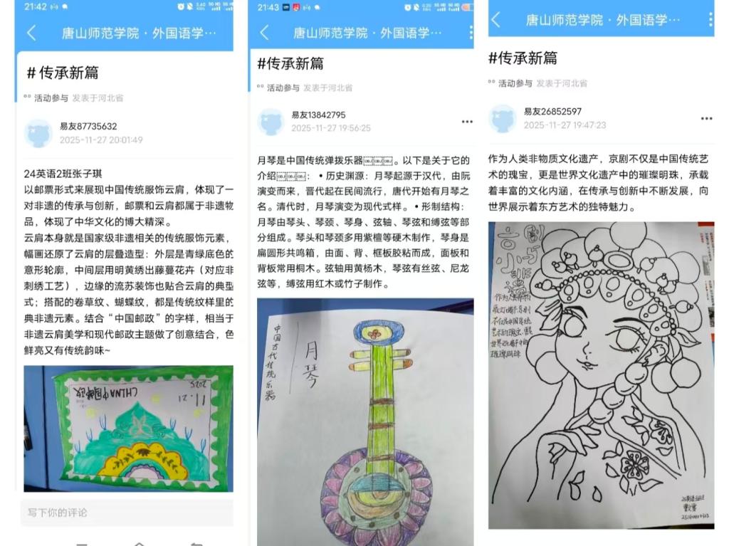 除了现场创作环节外,活动还设置了作品展示与交流讨论环节。参与者不仅可以展示自己的创作成果,还能通过观摩其他同学的作品,获得新的灵感和启发。所有完成的作品均按要求拍摄上传至易班平台"活动参与"专区,实现了线上线下联动的良好效果,扩大了活动的影响范围。