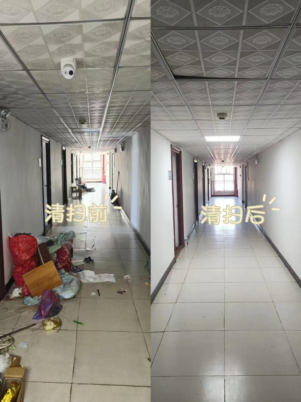 扫地、擦桌子、扔垃圾、整理柜子……经过两个多小时的打扫,原本积满灰尘的宿舍变得窗明几净。干净整洁的桌面,宽敞明亮的房间。室外有设备齐全的开水间,窗外有郁郁葱葱的树木,走廊的两端有干净明朗的水房,宿舍里整洁宽敞,共同迎接新同学们的到来。