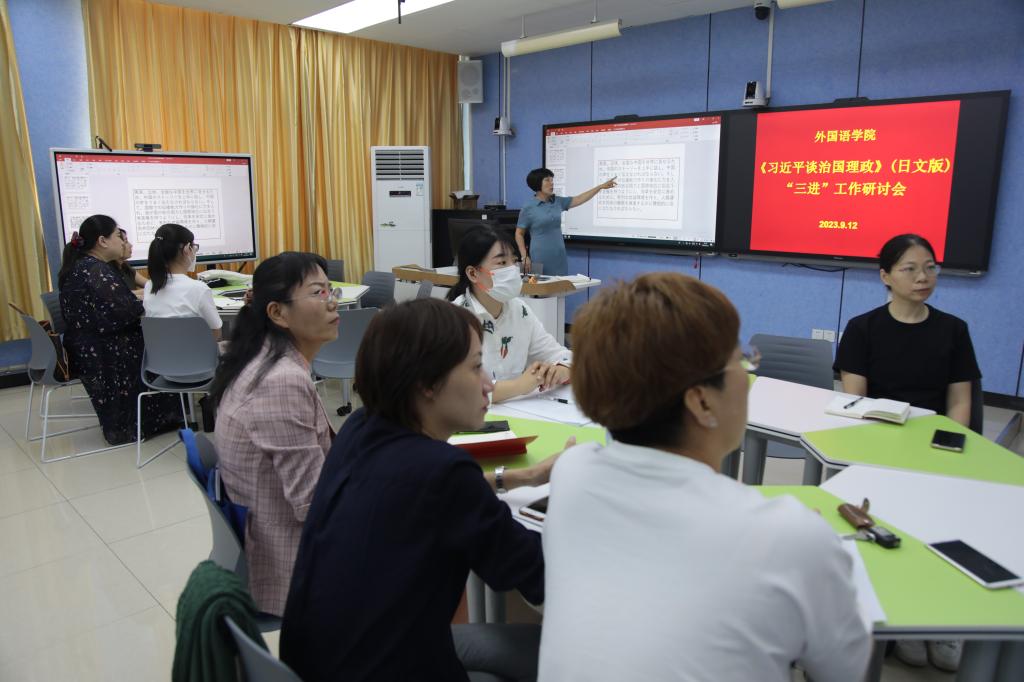 为进一步推进“三进”工作向纵深发展,增强公司全体教师的政治敏锐性和业务水准,改革创新教学形式,盘活外语专业思政教学资源,suncitygroup太阳新城于9月12日下午在晶博楼智慧教室和未来教室召开《习近平谈治国理政》(英日德文版)“三进”工作研讨会。研讨会由各教研室主任主持,公司全体教师参加。