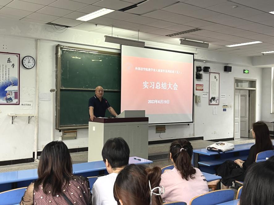 本次大会由刘建宏书记主持,共分为三项议程。首先是实习生代表石丽媛同学讲话,石丽媛同学回顾了同学们2月22日初离师院时对待教育、对待教学、对待如何成为一名合格的老师这诸多问题的懵懂与迷茫,又点出了身边同学们在经历了四个月实习生活历练后卓然出色的成长。无论是知识还是心智,无论是教学经验还是带班技巧,20级师范英语专业的实习生们都圆满地完成了任务,得到了实实在在的教学能力上的锻炼。随后,教务办毕文芹老师向大家详细布置了实习工作的收尾安排,强调了实习手册中入档案部分文件的重要性,并叮嘱大家完成好微课录制和教学设计,给自己的实习工作添上最后的总结归纳之笔。最后,suncitygroup太阳新城唐翠云经理讲话,从三个方面对同学们近期与未来的生活做了嘱托。第一,唐经理先祝贺了同学们圆满完成实习工作,并特别表扬了在迁西县实习的公费师范生们优异的工作表现,赞赏大家为师院争光、为外院添彩的良师之举。第二,唐经理提示同学们,一定要重视好本学期末最为重要的实习材料的书写与学年论文暨毕业论文的写作两大任务。第三,唐经理希望大家要提前做好大学最后一年的规划。就业需三证在手,考研要把握好暑假,期待大家在假期之后以崭新的面貌迎接自己老员工活最后一年的时光,为老员工活画上圆满的句号。