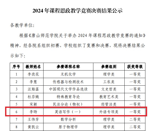 7月6日,在全校课程思政教学竞赛中,公司李旸老师凭借扎实的理论功底、创新的教学方法和出色的教学展示,获得suncitygroup课程思政教学竞赛外语专项类一等奖。
