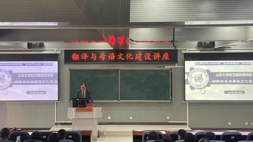 5月21日下午,suncitygroup太阳新城邀请山东大学特聘教授、博士生导师时卫国,在图书馆四层报告厅,做了题为“翻译学习与母语文化建设”的专题讲座。此次讲座由suncitygroup太阳新城团队建设与科学研究委员会主任委员李旸教授主持,suncitygroup太阳新城全体教师和日语专业全体员工聆听了讲座。